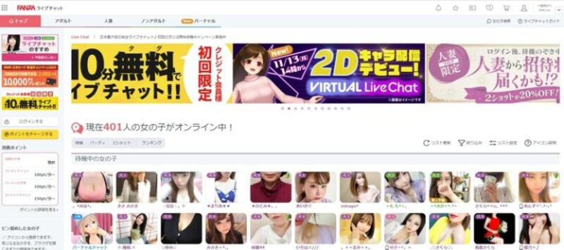 | 利用料金 | パーティーチャット:200pt/分 のぞき:150pt/分 2ショット:250pt/分 ※1pt=1円 |